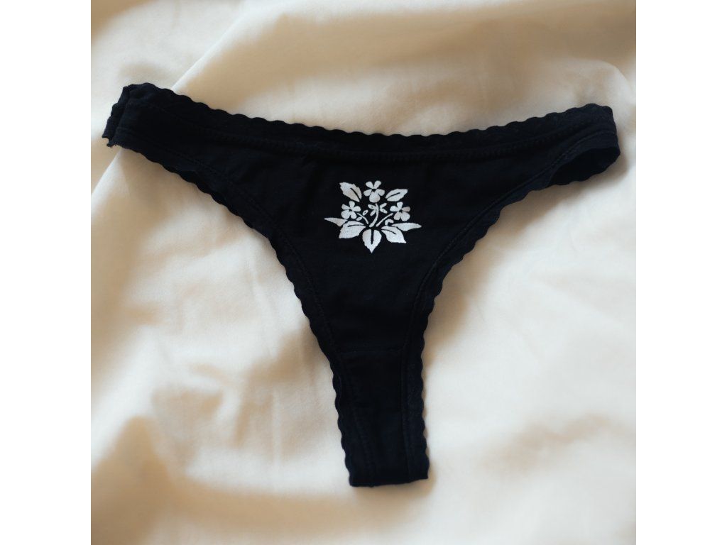 Bavlněné kalhotky s ozdobnou elastickou gumou potiskem fialky. Ručně šité a potisknuté přímo v České republice.